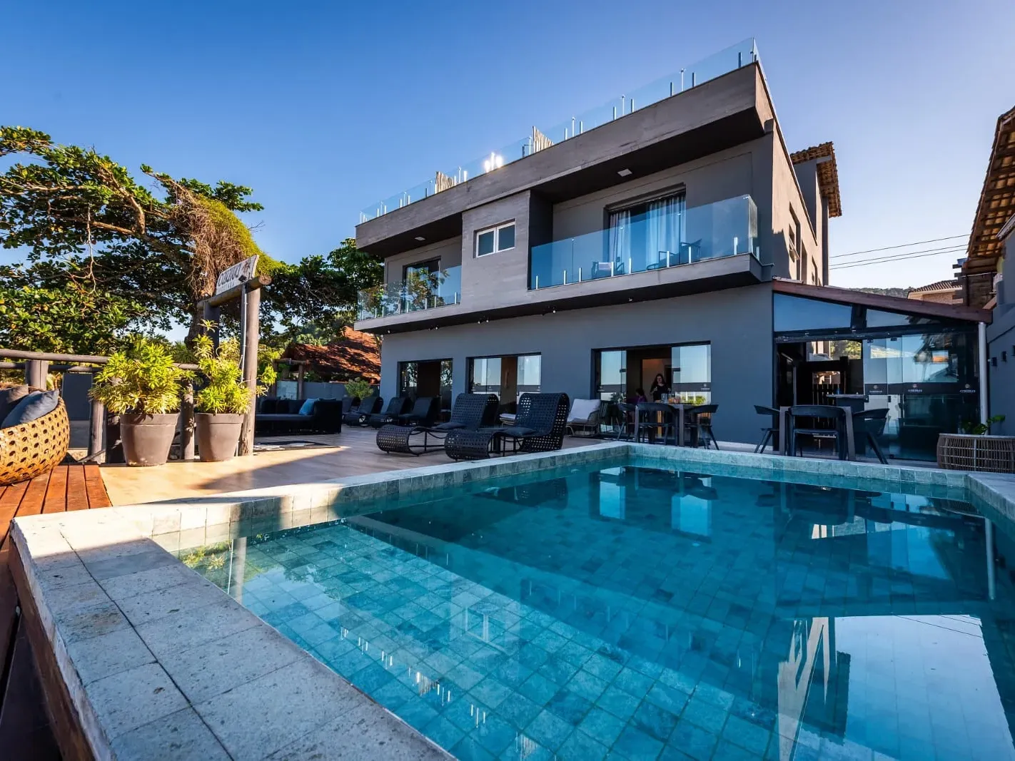 Além da piscina, contamos com confortáveis chaise longues, onde você poderá apreciar uma vista deslumbrante