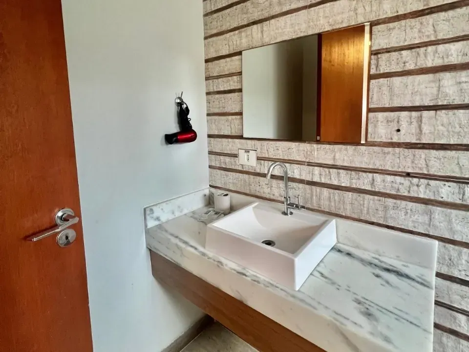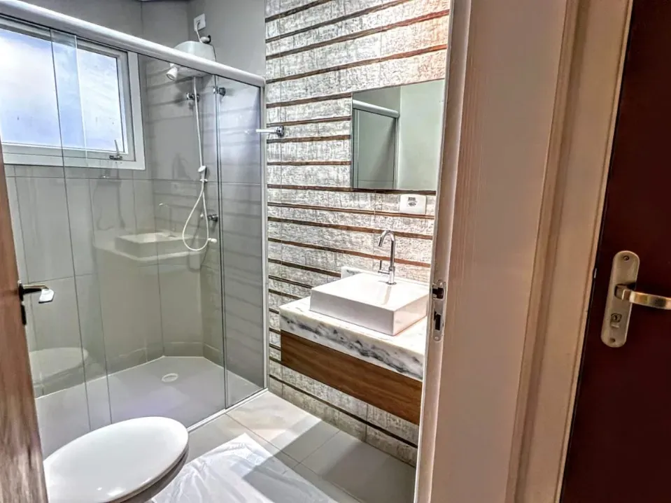 Localizada no piso térreo, nossa suíte oferece o conforto de uma cama Queen Size e mais uma cama de solteiro, TV Smart e ar-condicionado para garantir noites tranquilas. O banheiro, amplo e aconchegante, proporciona praticidade e bem-estar durante sua estadia.