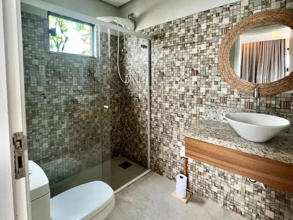 Para completar sua experiência, a suíte dispõe de itens essenciais para uma estadia confortável: TV Smart, ar-condicionado e um banheiro aconchegante, pensado para o seu bem-estar.