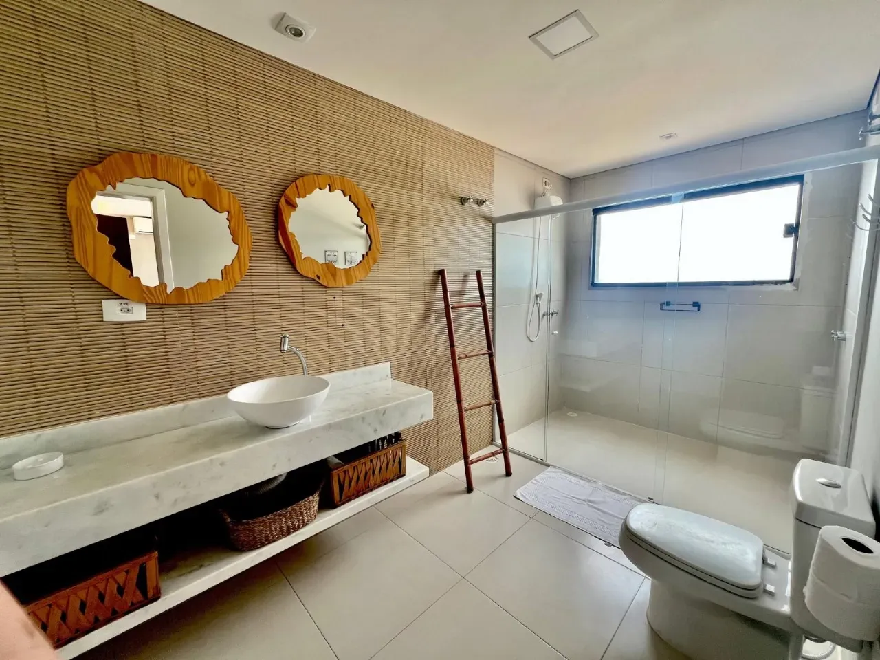Localizada no piso superior, esta suíte oferece o conforto de uma cama de casal e mais duas de solteiro, ideal para noites de descanso pleno. Seu diferencial está na encantadora vista lateral para o mar de sua janela, que permite apreciar o suave som das ondas e sentir a tranquilidade da praia mesmo de dentro do quarto.
